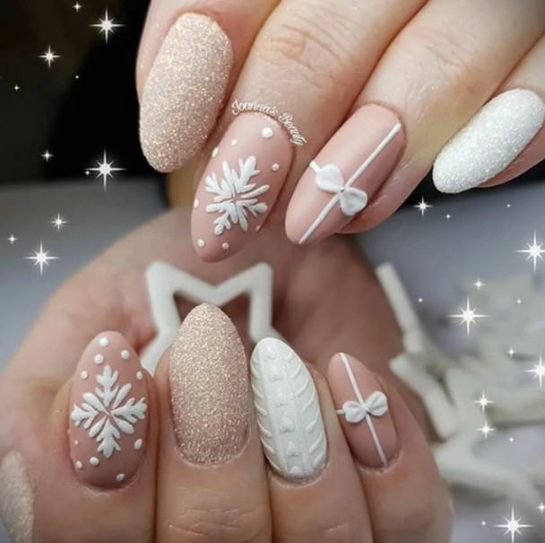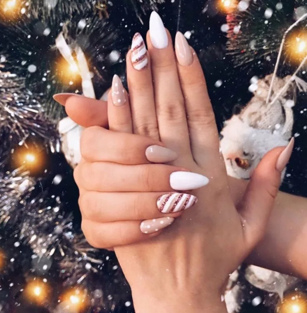 Ни один Новый год нельзя представить без елочки. Она тоже считается символом праздника, поэтому ее можно использовать в качестве референса для рисунка. Настоятельно рекомендуется избегать принтов с классической елочкой. В 2022 году актуальны новогодние деревья, выполненные в виде геометрии. Рисунок рекомендуется наносить на белое покрытие. А чтобы оформление создавало настроение праздника, некоторые ногти можно украсить глиттером.