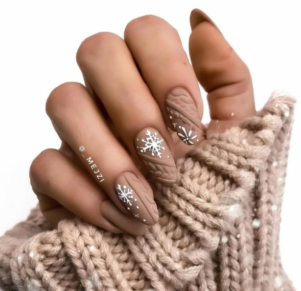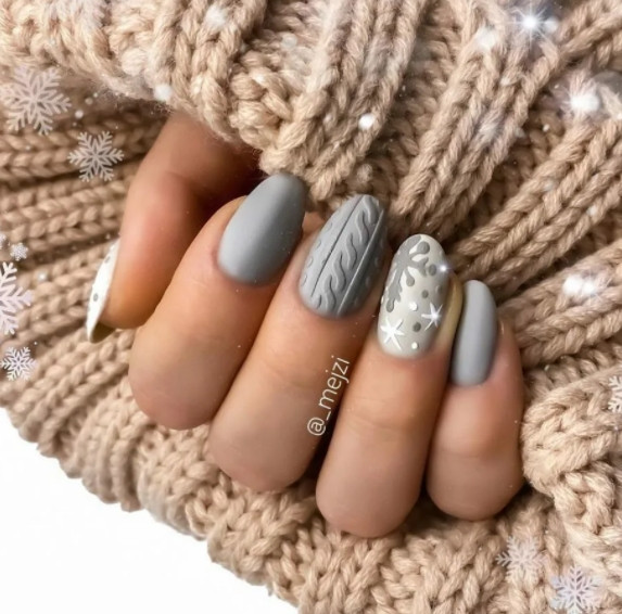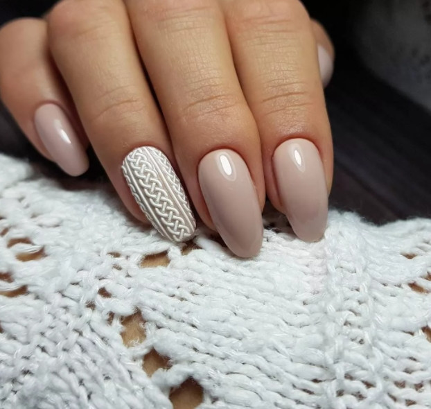 У многих Новый год ассоциируется с теплом и уютом. Поэтому в последние 5 лет большим спросом пользуется «вязаный» маникюр. Новогоднее оформление ногтей создается в виде фактуры свитера. Обычно таким декором украшают только один палец.