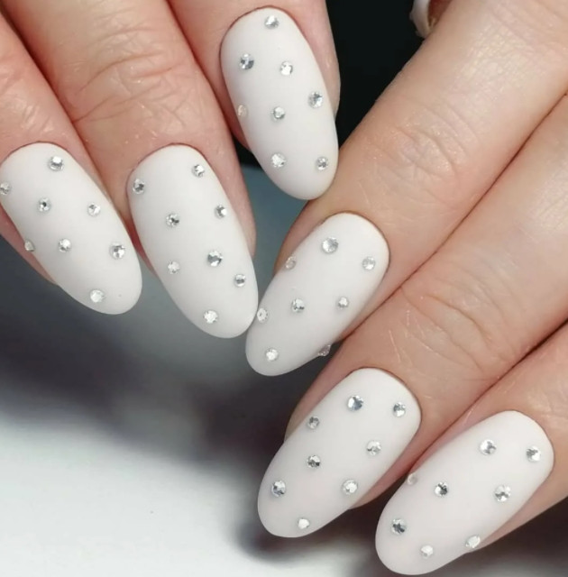 Смелые девушки могут рискнуть и создать на ногтях настоящее произведение маникюрного искусства. Этого можно достичь при помощи стразов. На ногти наносят монохромное и глиттерное покрытие, после чего на одном из них выкладывают звездочку из камешков. В таком случае лучше всего использовать бусины разных размеров. Так объемный рисунок будет интереснее смотреться.
