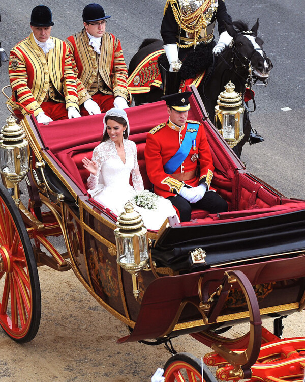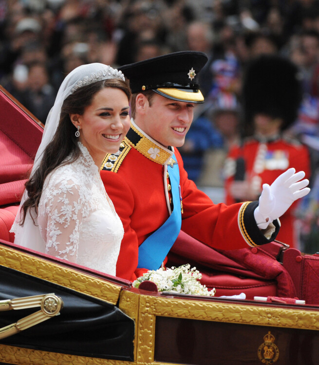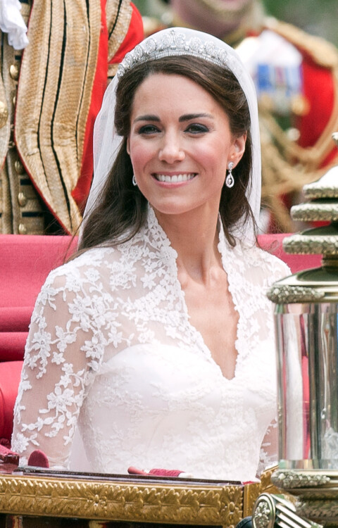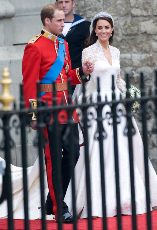 Кейт Миддлтон и принц Уильям, 2011Кейт для одного из самых важных событий в жизни выбрала белое платье классического силуэта от британского дизайнера Сары Бертон, креативного директора модного Дома Alexander McQueen. Образ герцогини Кэтрин был создан в лучших традициях королевской семьи – рукава и лиф платья были расшиты кружевными цветами-символами Великобритании, а шлейф невесты достигал длины 3 метра. Голову Кейт украшала бриллиантовая тиара Cartier Halo, подаренная ей королевой Елизаветой II. Что касается жениха – принц Уильям был в форме своего почетного звания полковника ирландской гвардии.