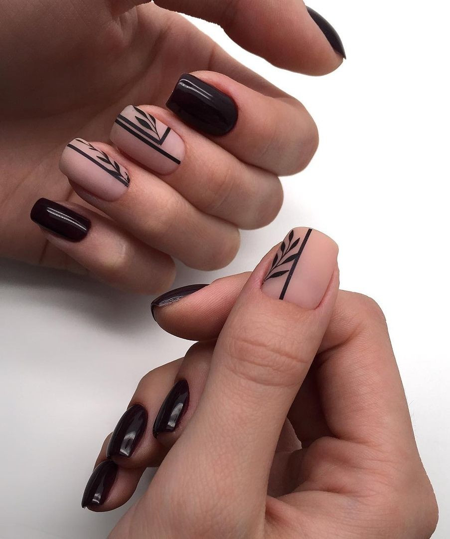 Такой дизайн можно создать с помощью черного гель-лака и двух топов: глянцевого и матового. Выглядит рисунок эффектно, ненавязчиво. Принт неяркий, поэтому в глаза бросаться не будет и быстро не надоест.