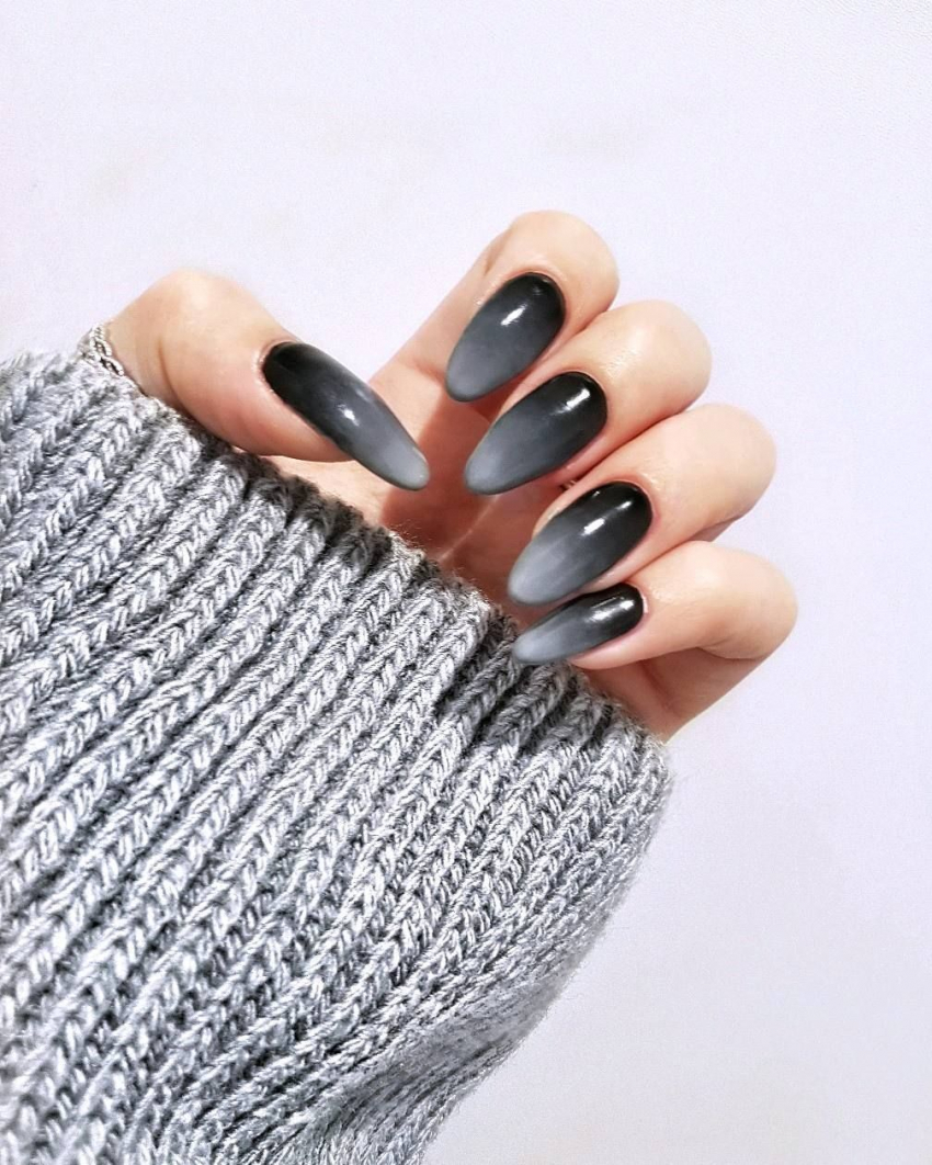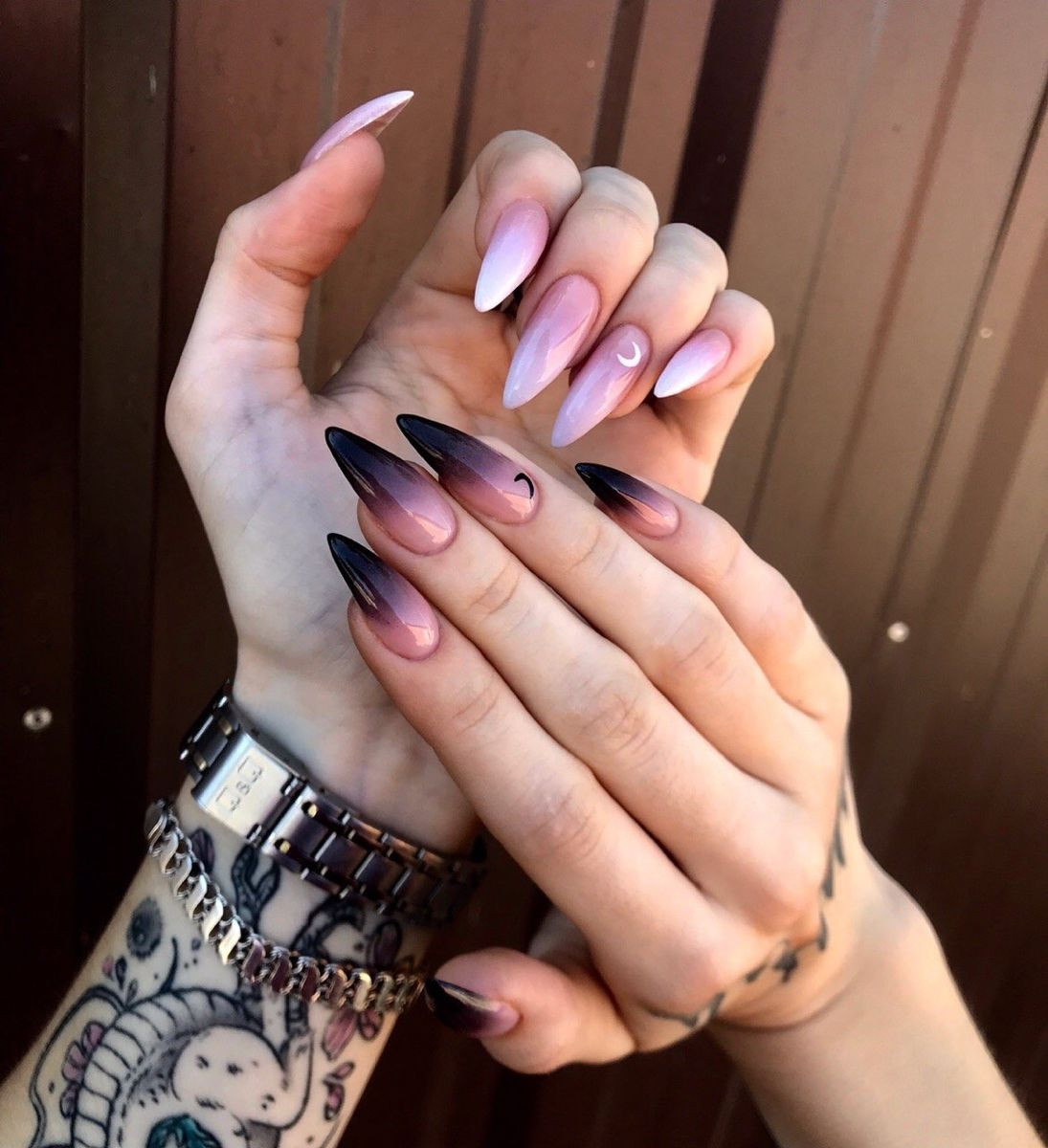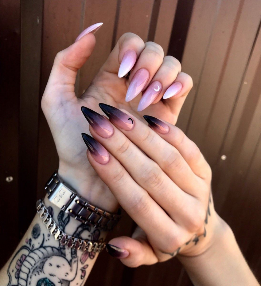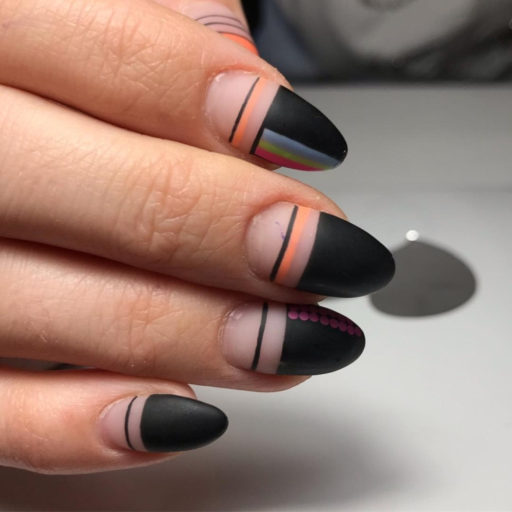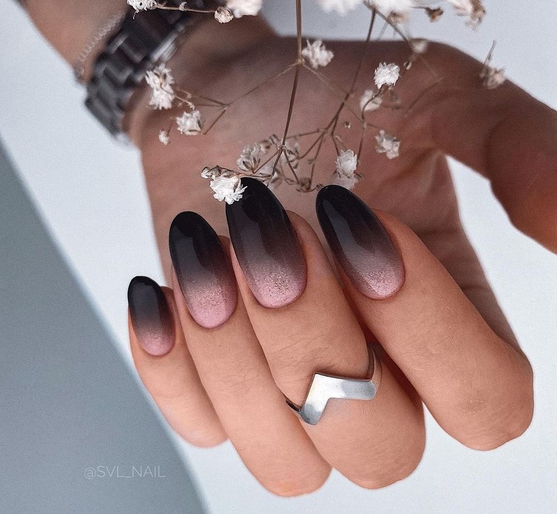В сочетании с черным для градиента подойдет почти любой цвет. Стилисты советуют делать переход из нюдовых оттенков в темный. Также в качестве второго цвета можно выбрать неоновый зеленый, синий или оранжевый. Классический градиент — сочетание черного и белого.