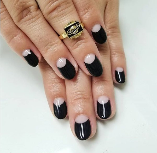 Этот дизайн станет трендом предстоящего сезона. С черным маникюром прозрачные лунки смотрятся намного эффектнее, чем цветные. Некоторые девушки отказываются от них, поскольку боятся, что это будет выглядеть, как отросший ноготь. Однако лунки имеют обратный эффект. Благодаря прозрачному лаку отросшая ногтевая пластина не бросается в глаза, что позволяет дольше носить гель-лак.