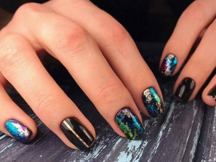 Финальное покрытие может быть глянцевым или матовым. Если хочется необычный дизайн, попросите мастера зафинишировать все «бархатным» топом, а участки с фольгой выделить глянцем.
