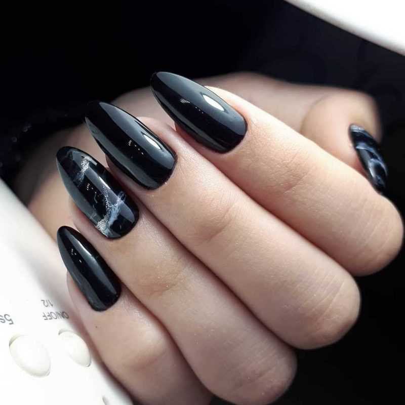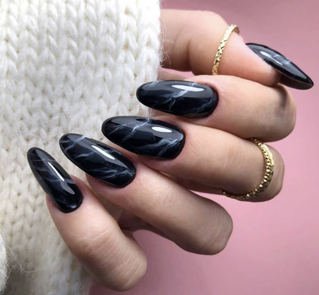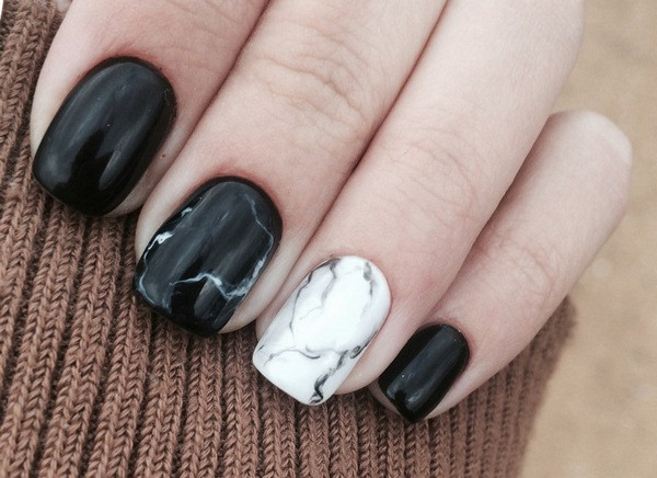 Мраморный дизайн ногтей появился относительно недавно, но сумел запасть в душу многим девушкам. В черном цвете принт выглядит не менее интересно, чем в светлых оттенках.