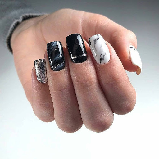 Также можно добавлять нюдовые оттенки, чтобы придать рисунку правдоподобный вид. Мраморный узор будет отлично смотреться как на всех ногтях, так и в качестве декоративного элемента, например, на безымянном или большом пальце. Если для декора не используются блестящие лаки, такой маникюр подойдет для повседневной носки или для тех, кто работает в офисе со строгим дресс-кодом.