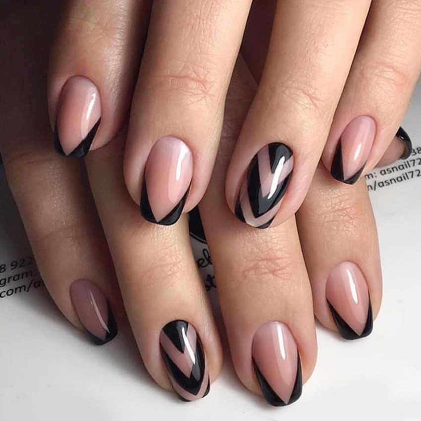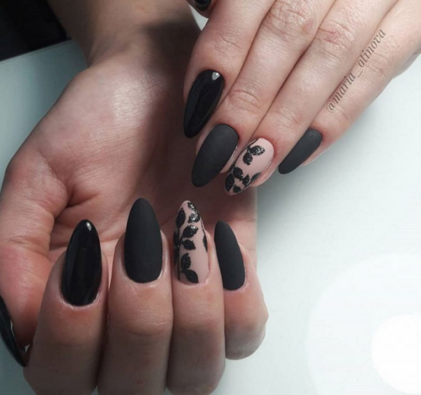 При выборе черного цвета для ажурных узоров стилисты советуют сочетать его с нюдовыми подложками, также можно добавить френч.