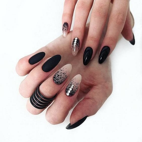 Стилисты советуют наносить декор только на несколько ногтей, чтобы маникюр не выглядел вульгарно. Например, можно выложить блестки на безымянный палец и сделать матовое покрытие, а остальные покрасить черным глянцевым лаком.