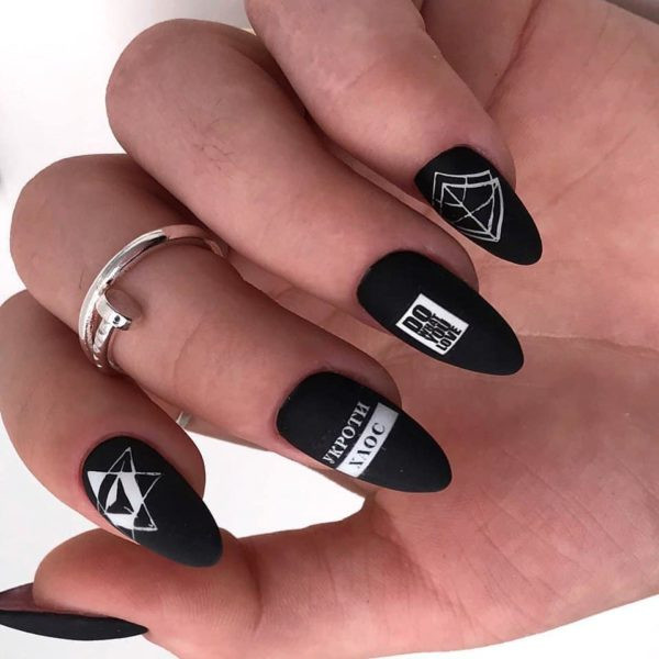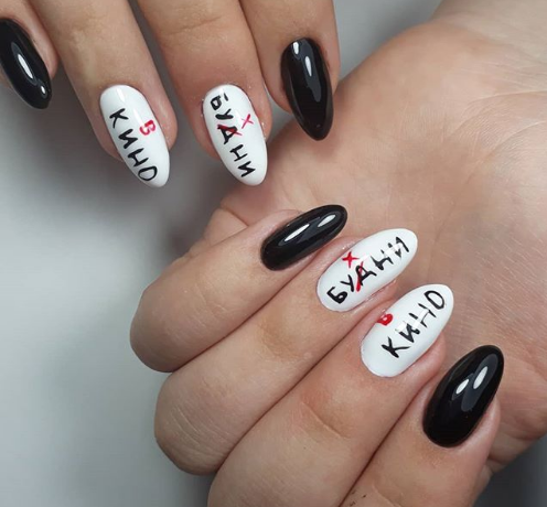Надписи могут быть и черного цвета. Один из вариантов трендового маникюра — темный текст на белой или нюдовой подложке. При этом светлым будет только один ноготь, все остальные — черные.
