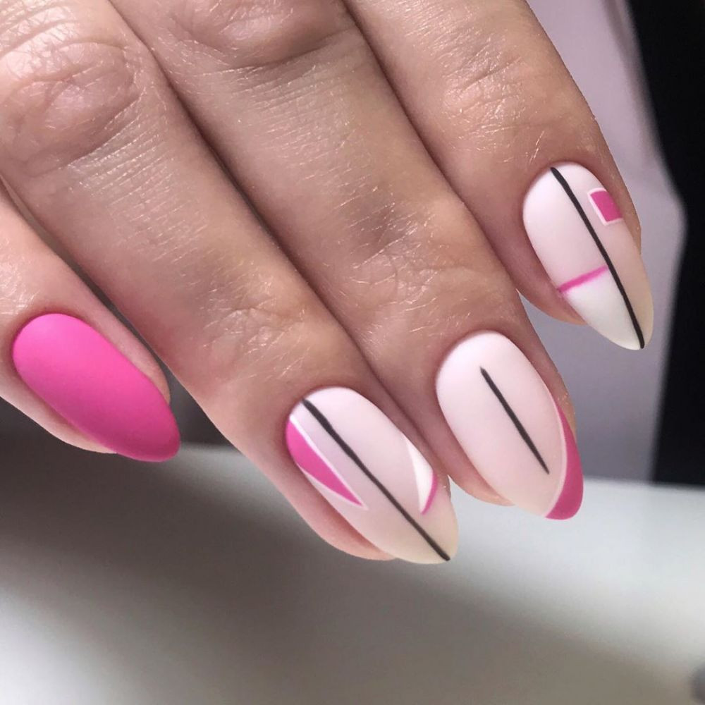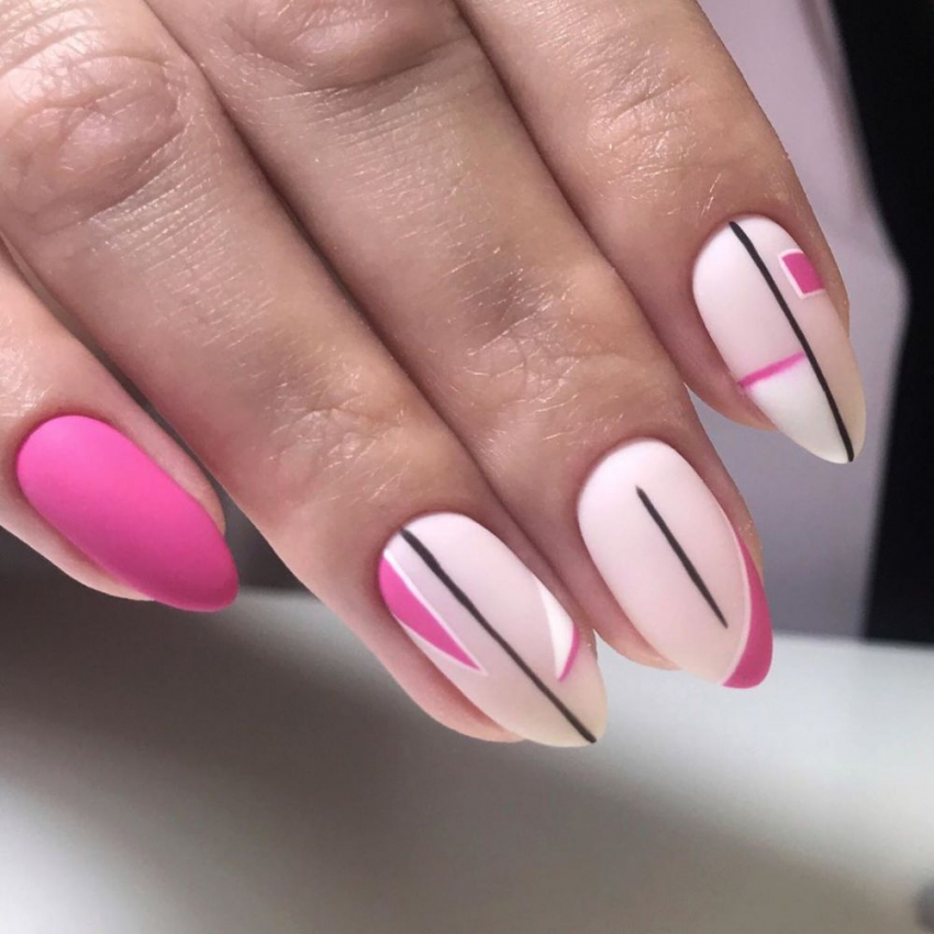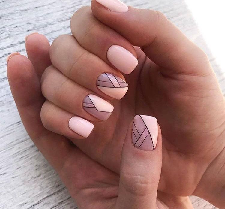 Отлично раскрывается матовый дизайн с геометрическими линиями. Хорошо смотрится такое сочетание на коротких ногтях.