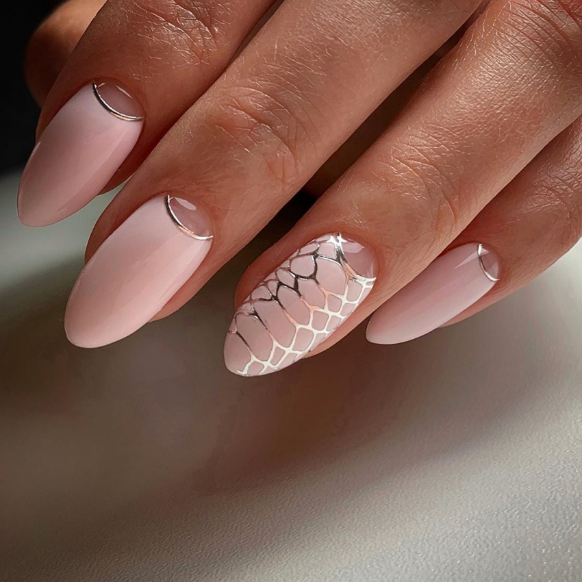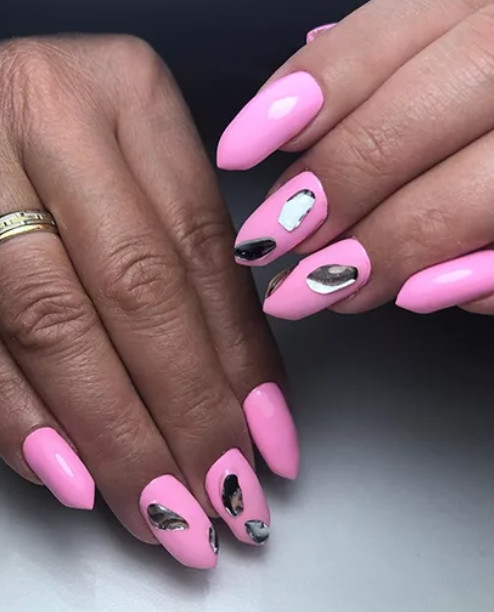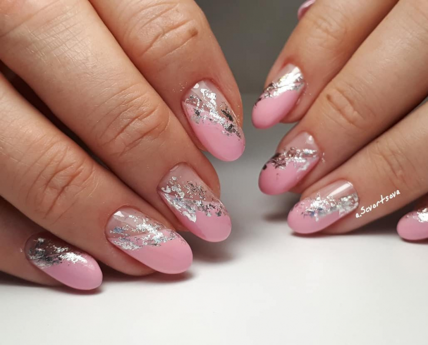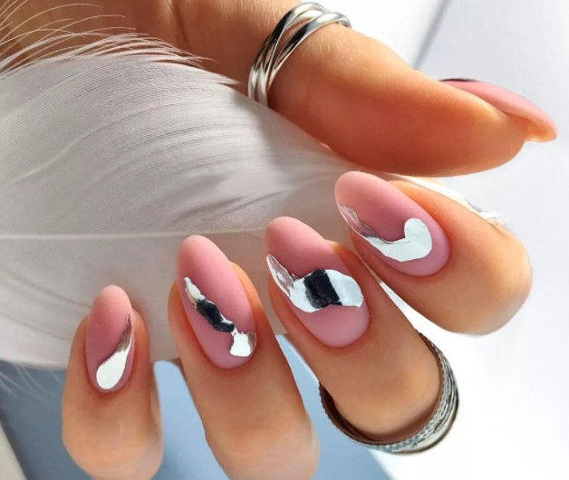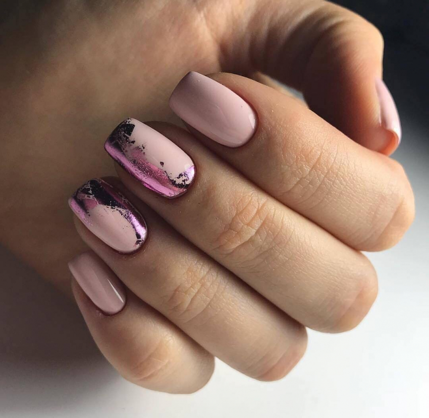 Интересный вариант получается при комбинировании техник. Например, сочетание фольги с нанесением рисунка. Можно дополнительно использовать наклейки-слайдеры. Это создаст интересный дизайн. Использование фольги допустимо для повседневного и праздничного маникюра. Она будет хорошо смотреться со всеми оттенками розового цвета. Металлизированные элементы способны сочетаться с одеждой разных направлений и стилей. Это хорошая альтернатива стразам, которые чуть отошли от стильных направлений сезона 2021-2022.