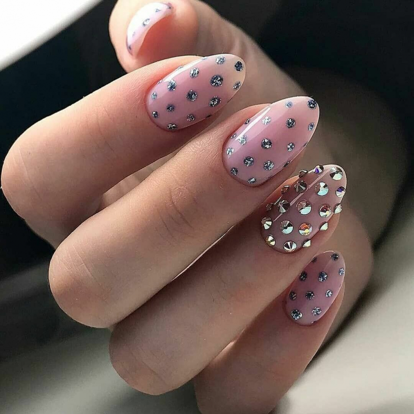 Розовый цвет перестал быть подростковым. Теперь он больше относится к всесезонному нейл-арту, который хорошо сочетается с большинством оттенков, уместно смотрится в будни и праздничные дни. У розового цвета много оттенков, подтонов. Он хорошо ложится, придает нежность, очарование. Самые лучшие композиции со стразами смотрятся именно на розовом фоне.