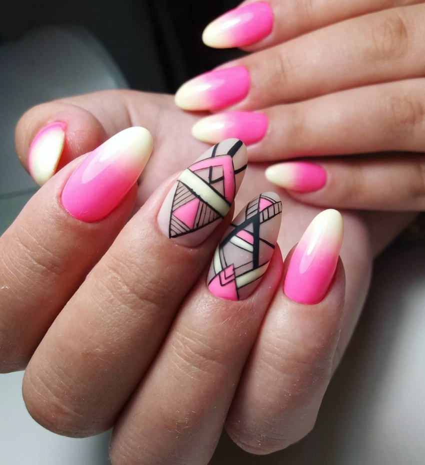 Это сочетание 3-5 контрастных оттенков с прямыми линиями, геометрическими элементами. Мастер вычерчивает на ногте разные правильные фигуры, проводит прямые линии, которые могут пересекаться или нет. Потом раскрашивает участки в яркие цвета гель-лаком. Особенность этого дизайна в применении контрастных оттенков, сочетании насыщенных цветов. На разных пальчиках можно не повторять узоры, сохранять только общий цветовой фон.