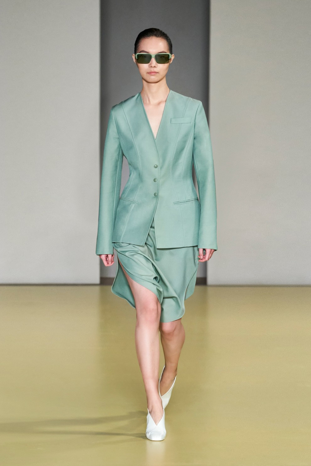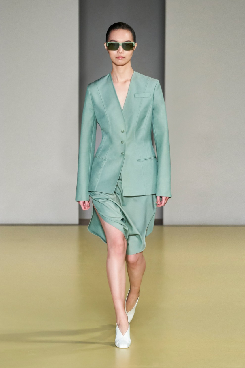 BossВ этом сезоне весна-лето 2021 коллекция Boss была посвящена монохромной пастели. Вслед за серией образов в небесно-голубом цвете и бежевой гамме, на подиуме появились платья, брючные костюмы, ветровки и тренчи в оттенке перечной мяты. Sportmax решили разнообразить свою повседневную коллекцию эффектным вкраплением в виде атласного двубортного жакета, который подошел был для самой шумной летней вечеринки.