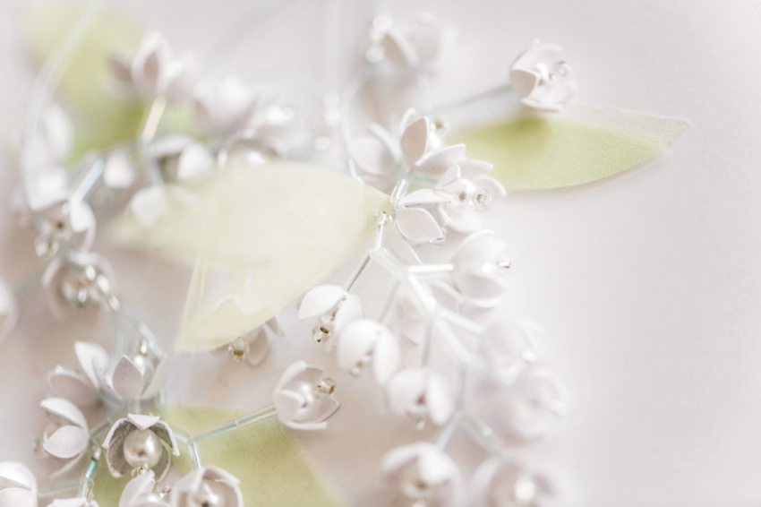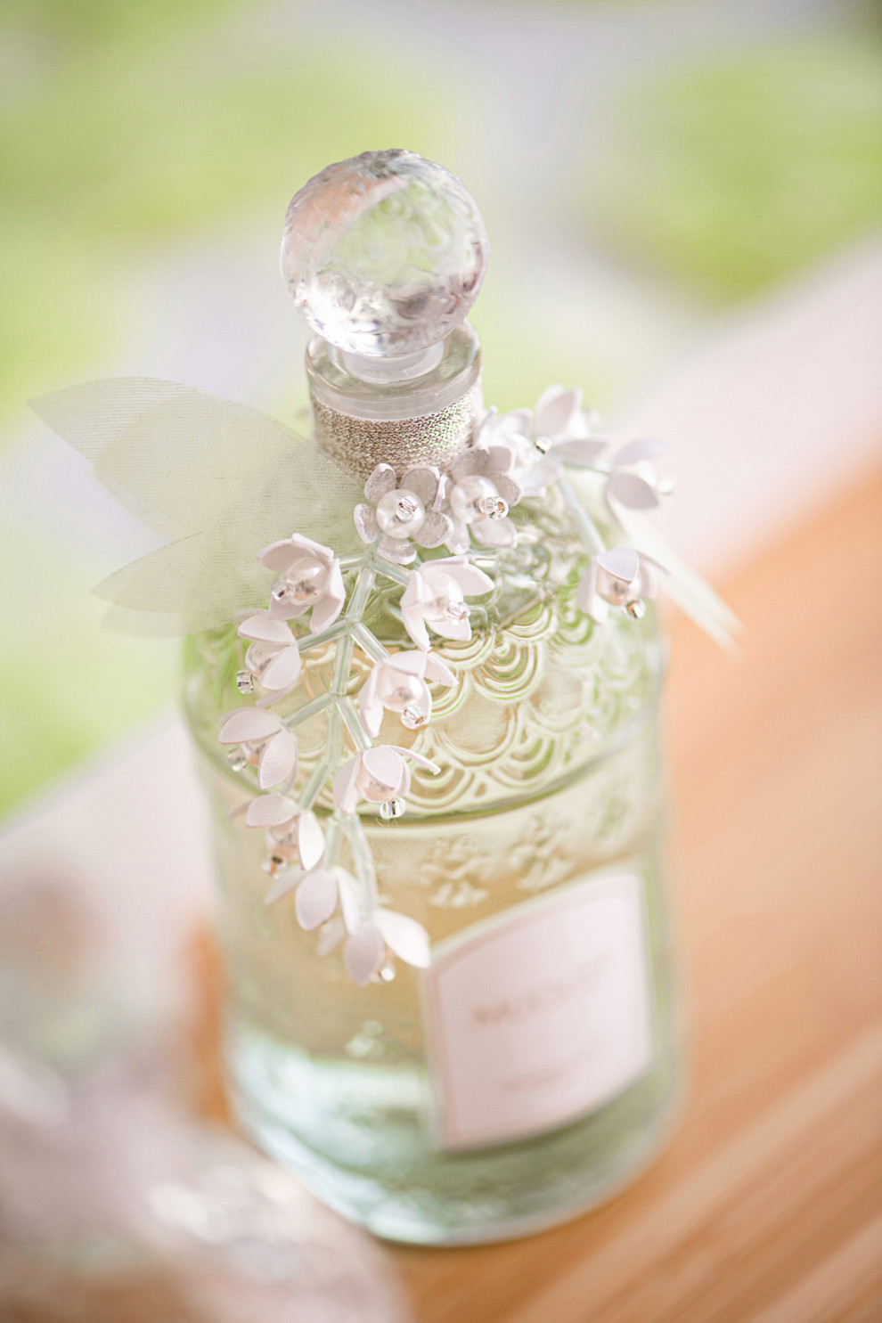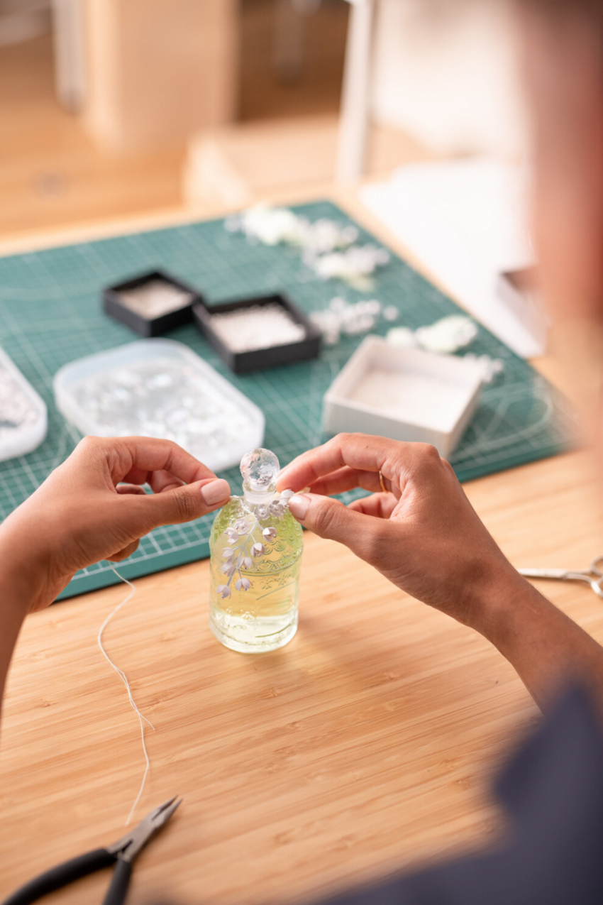 Дизайнер Люси ТуреОна создала декор haute couture, используя в качестве сырья не ткань или вышивку, а бумагу. Сложные трехмерные украшения полностью созданы вручную: ландыш в полном цвету, изящно переходящий к вершине флакона.