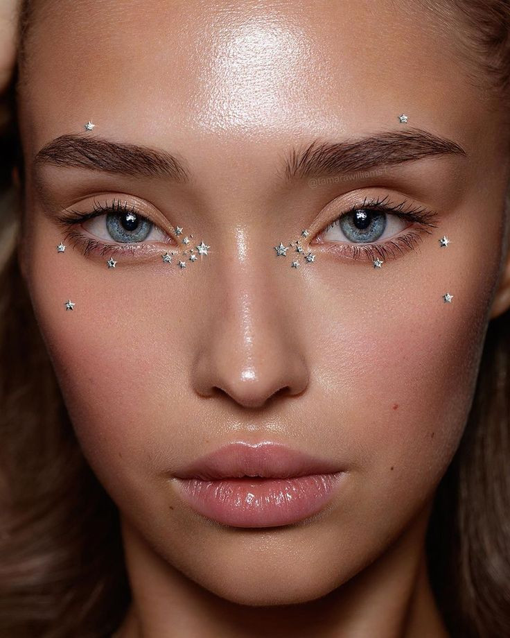 Для модниц, которые любят выделяться в толпе, в грядущем году модные визажисты предлагают тематический мейкап, который выглядит очень необычно, смело и интригующе. Голографические стразы, россыпь переливающихся блесток, различные капельки, пайетки и снежинки помогут создать самые смелые и необычные образы.