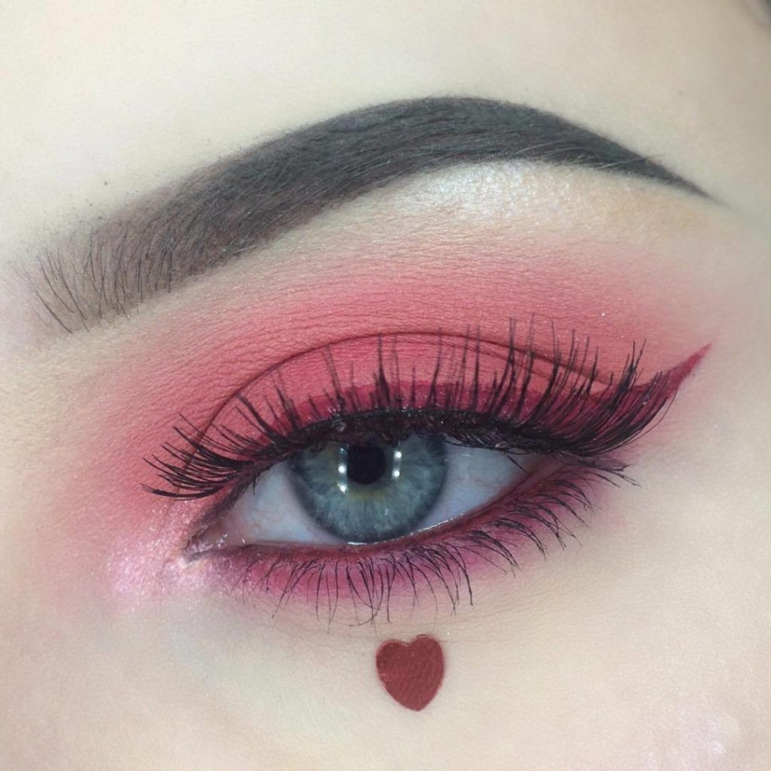 Нежным и романтичным натурам наверняка придется по вкусу эта необычная идея. Ничего сложного в этом нет, нужно просто дополнить нанесенный макияж милыми сердечками небольшого размера в области верхних век. А чтобы они красиво выделялись в макияже, для их нанесения используйте насыщенные оттенки коричневого, на которых маленькие нюдовые сердечки будут смотреться просто восхитительно. Эта необычная идея поможет создать романтичный макияж на Новый год 2022 для женщин с голубыми глазами.