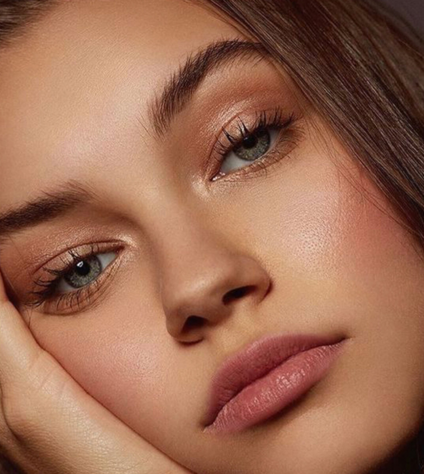 Сделать губы более яркими и придать взгляду большую выразительность поможет макияж, выполненный в натуральных тонах. Подобный образ идеально подойдет для празднования новогоднего торжества в кругу близких людей и для корпоративной вечеринки. Разные оттенки бежевого, персикового и розового – идеальный выбор для натурального макияжа.