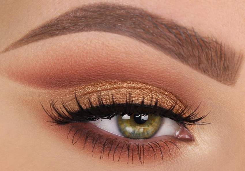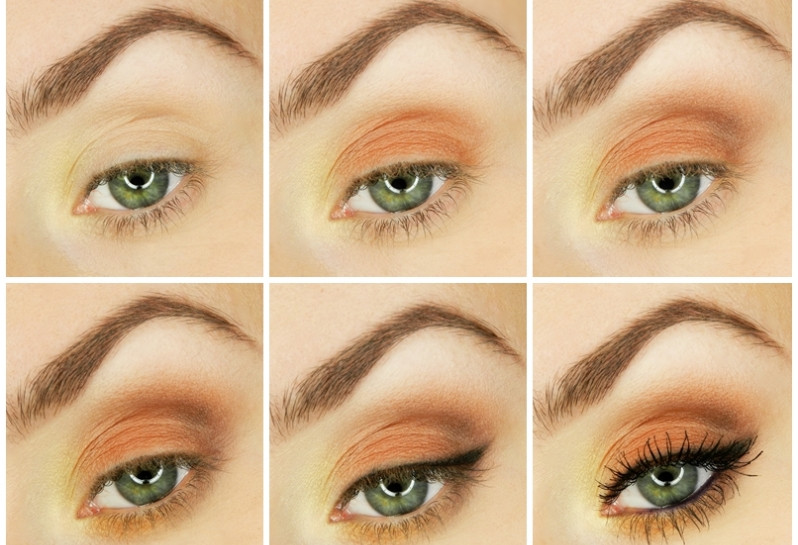 - Подвижное веко выделяем золотистым, а складку – оранжево-коричневым тоном. Нижнее веко следует прокрасить шоколадными тенями, растушевав их.