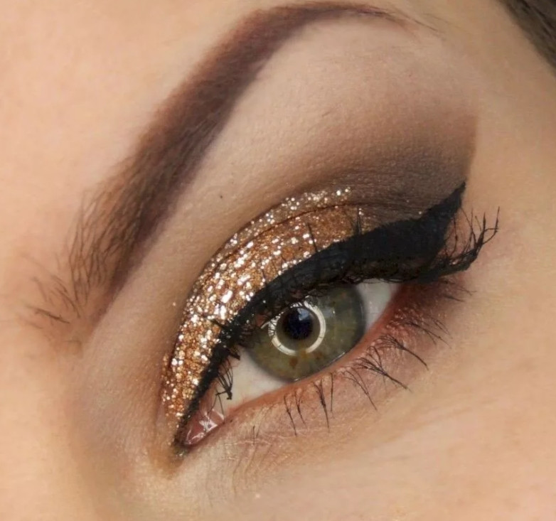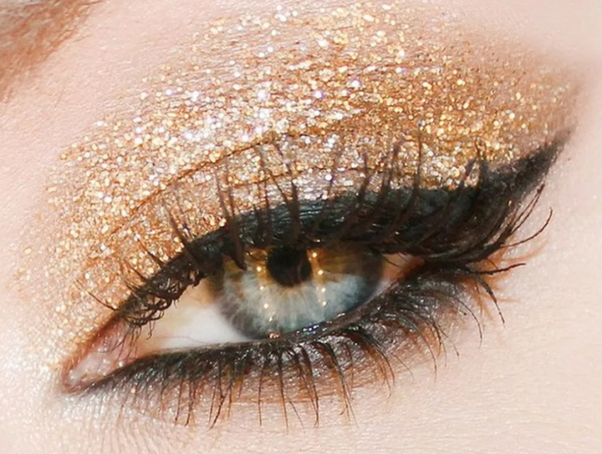Тени с эффектом золота всегда будут уместны для любого новогоднего вечера. Выбирая на Новый год макияж с сияющими тенями, непременно стоит позаботиться о том, чтобы цвет этих блесток идеально гармонировал с нарядом.