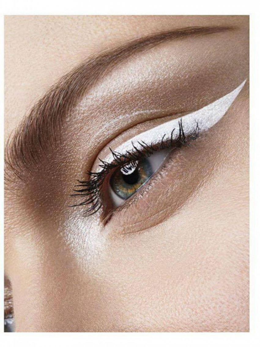 - Нарисовать черной или разноцветной подводкой идеально ровную линию вдоль роста верхних ресничек. Около внутреннего уголка глаза можно добавить золотистую подводку, а нижнее веко выделить изумрудным карандашом.