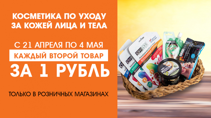 *Акция «Второй товар за 1 рубль» по группе «Косметика по уходу за кожей лица и тела» действует с 21 апреля по 4 мая 2021 г. в розничных магазинах «Галамарт».