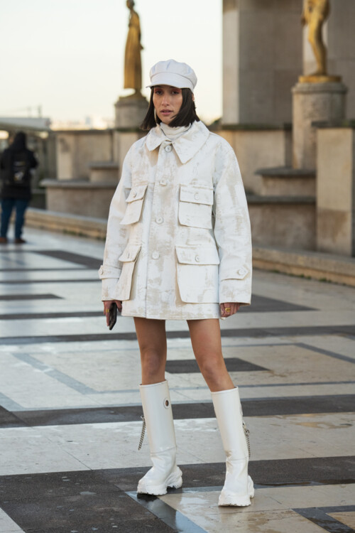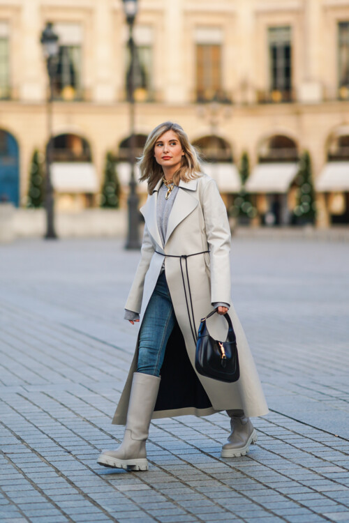 Настоящим амбассадором высоких резиновых сапог по праву можно считать Камиль Шарьер. В своих образах модница часто рифмует их с леггинсами, воздушными платьями, анималистичным принтом и кожаными жакетами. Лаконичным весенним комбо станут сапоги цвета хаки и пальто или блейзер в песочном оттенке. Образ, отсылающий к прогулке по сафари, не оставит никого равнодушным и быстро перенесет в долгожданное путешествие. Добавить наряду дух авантюризма помогут аксессуары: сумка crossbody нейтральных оттенков и характерный головной убор.