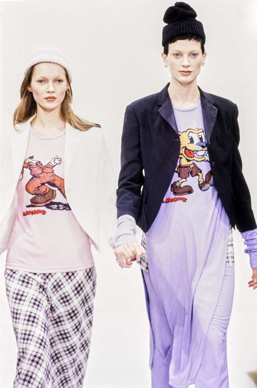 Grunge and Glory, американский Vogue, 1992Из чего состояла коллекцияВ самой коллекции Grunge весна/лето 1993 доминировал клетчатый принт. Разукрасил дизайнер наряды и другими узорами: цветочными, полоской, разнообразным горохом. Ими Джейкобс украсил всевозможные элементы одежды: от юбок длины миди и шортов до рубашек с рукавами разной длины, шарфов и лифов. Еще одной особенностью коллекции было то, что дизайнер перенес героев американских мультфильмов того времени на шифоновые рубашки. Образы дизайнер дополнил кедами Converse и ботинками Dr. Martens, и такое сочетание грубой обуви с одеждой на подиуме стало "удобной" новизной, за которую модницы благодарны до сих пор.