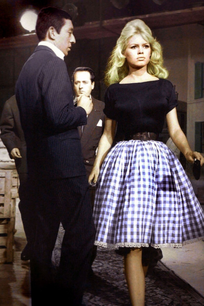 Брижит Бардо в фильме «Танцуй со мной», 1959Брижит Бардо в фильме «Танцуй со мной», 1959Вдохновившись свадебным платьем в розовую клетку, в котором Брижит Бардо вышла замуж за Жака Шаррье в июне 1959 года, художница по костюмам Розин Деламар решила воплотить свою страсть к клетчатому принту в знаменитой юбке в голубую клетку для фильма «Танцуй со мной». В этом фильме Мишеля Буарона, выпущенном в сентябре 1959 года, где она, в частности, работала вместе с Сержем Генсбуром, Брижит Бардо играет молодую решительную женщину, которая расследует смерть любовницы своего мужа. Пышная одежда с несколькими нижними юбками, подчеркивающими ее балетную талию, положила начало тенденции моды в клетку во Франции.