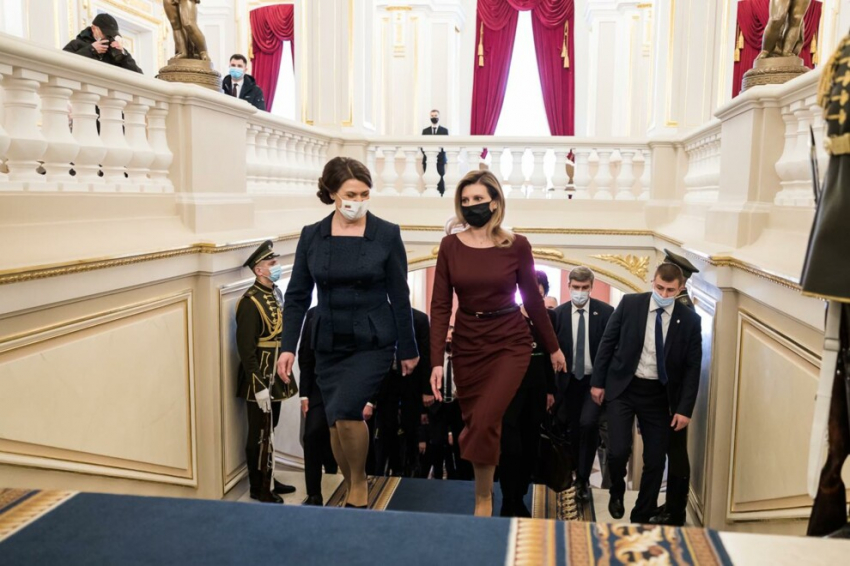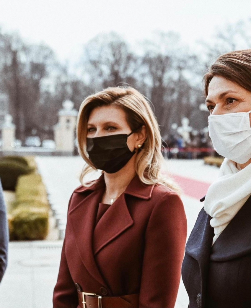 18 марта первая леди Украины Елена Зеленская приняла участие в торжественной встрече с президентом Литвы Гитанасом Науседа и его женой Дианой, которые прибыли в Киев с двухдневным официальным визитом. Состоялось мероприятие в Мариинском дворце, церемониальной резиденции Украины. Для столь ответственного повода Елена Зеленская выбрала образ украинского бренда A.M.G.
