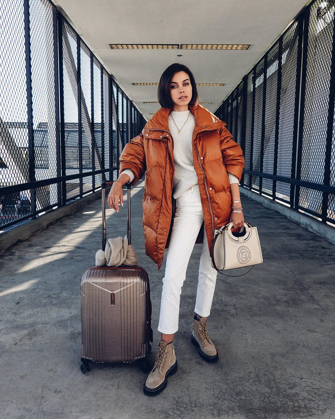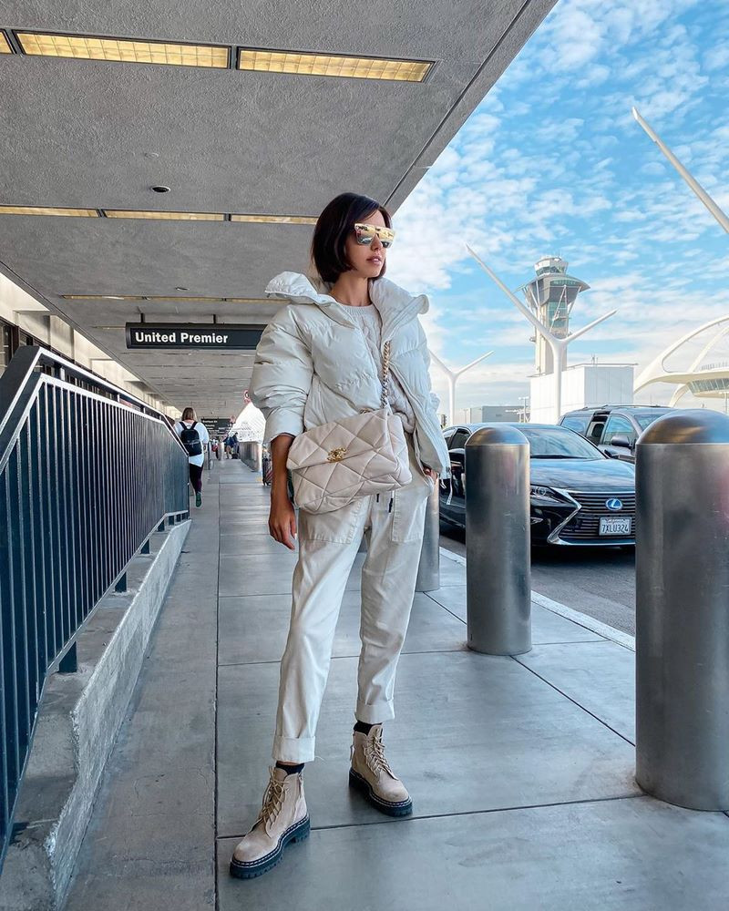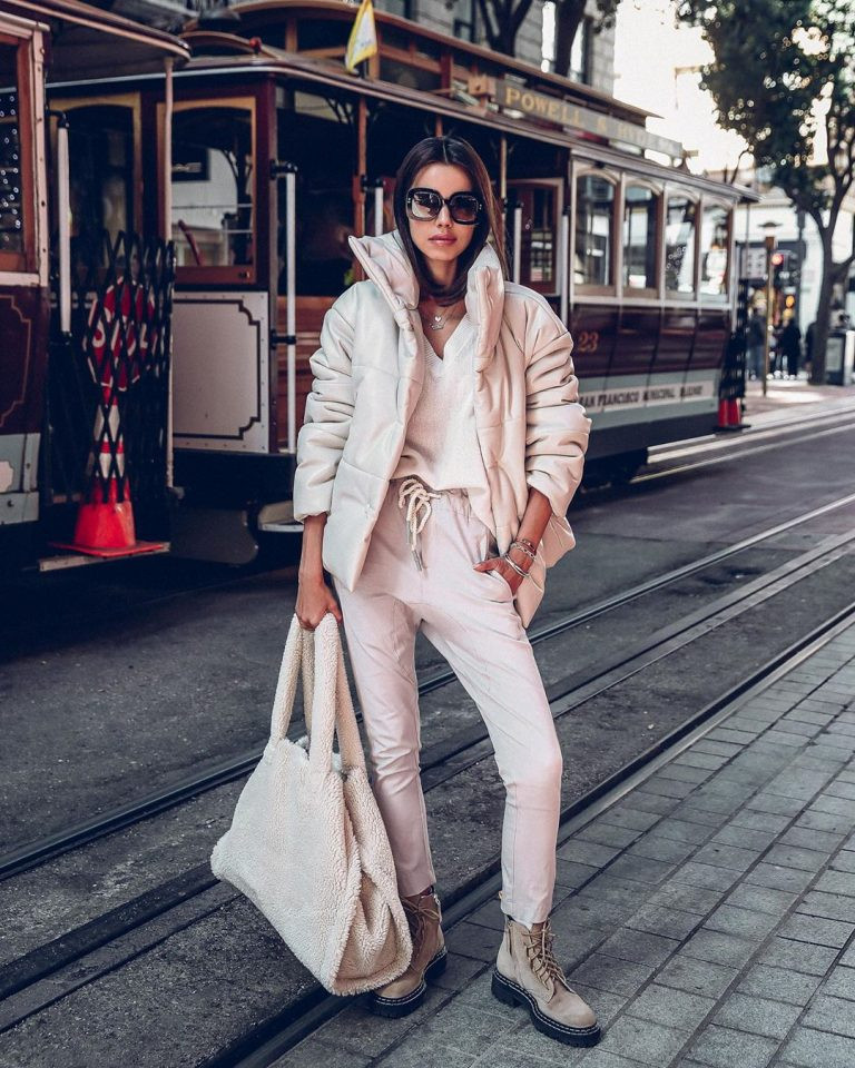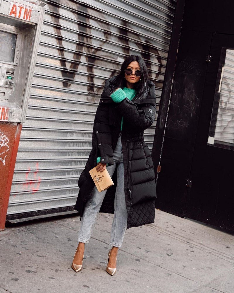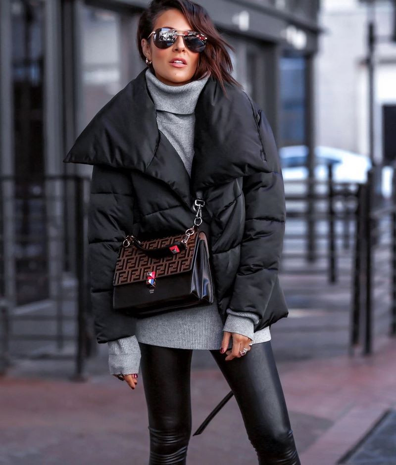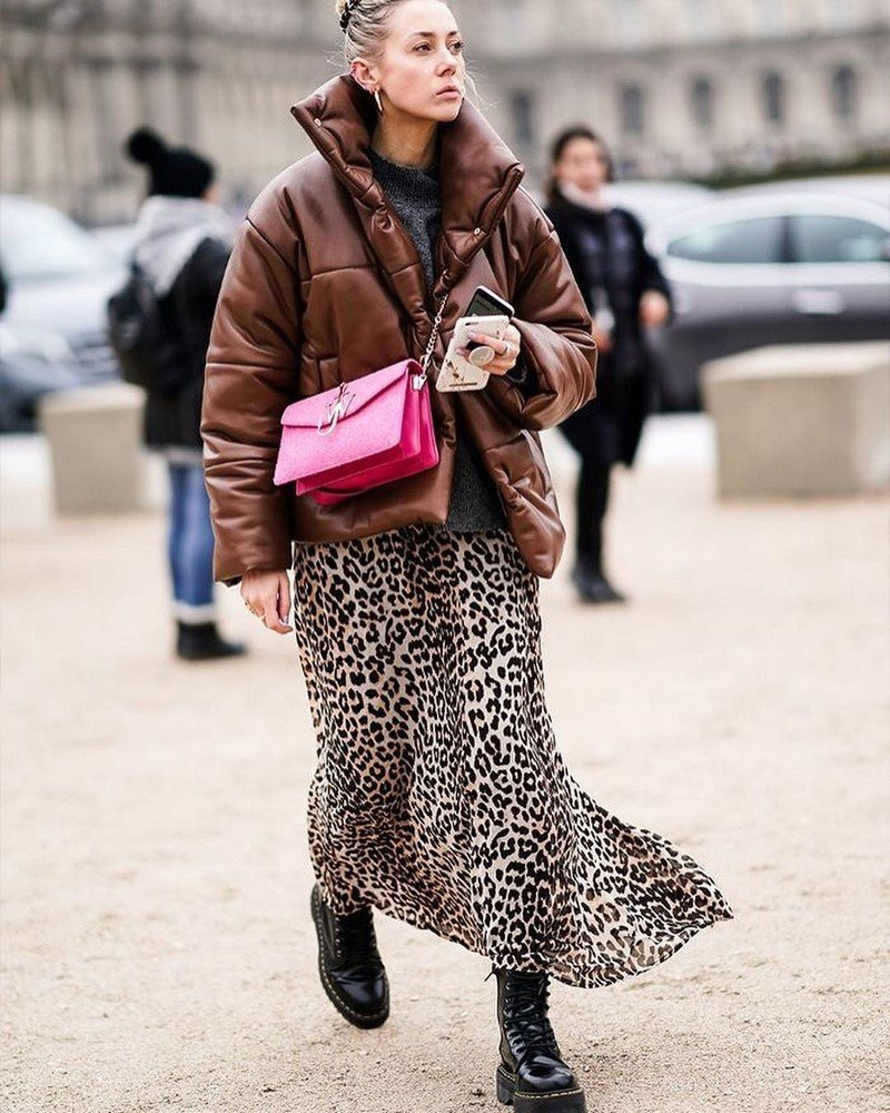 Такой предмет гардероба выглядит достаточно гламурно, поэтому и сочетать его надо с женственными вещами. В образ с пуховиком обязательно следует добавить юбку-карандаш, а также сапоги на высоком каблуке. Однако шпильки лучше не использовать.