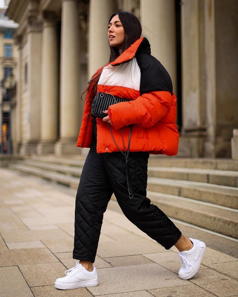 Такую верхнюю одежду следует сочетать с кроссовками или ботинками. Спортивные пуховики хорошо подходят для прогулок с детьми. Они выполнены из материалов, которые позволяют проводить на морозе много времени. Также этот предмет гардероба подходит для загородных поездок.
