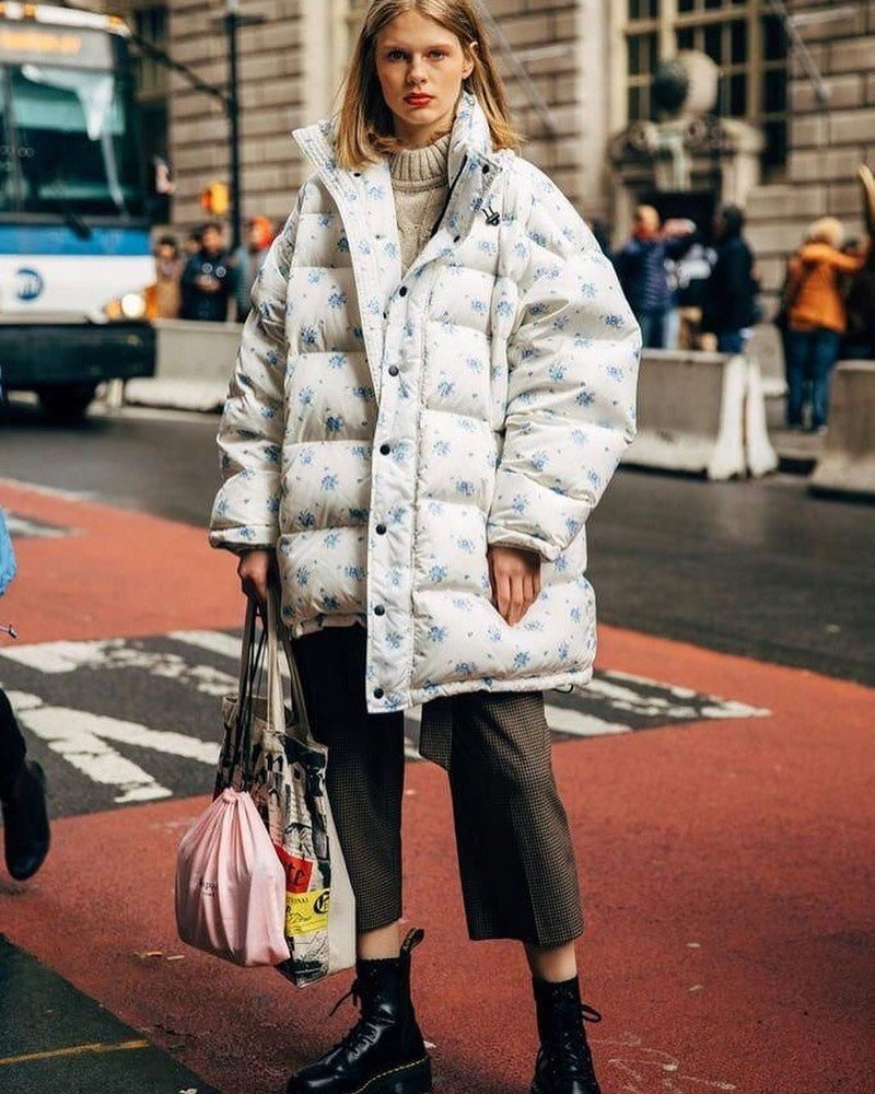 Принты придают одежде нестандартный вид. Можно самостоятельно украсить свой пуховик, чтобы он был в единственном экземпляре и подчеркивал индивидуальность. Такие вещи обычно носят со спортивной обувью и аксессуарами. Однако известные модницы сочетают кастомные пуховые пальто с сапогами на каблуке.