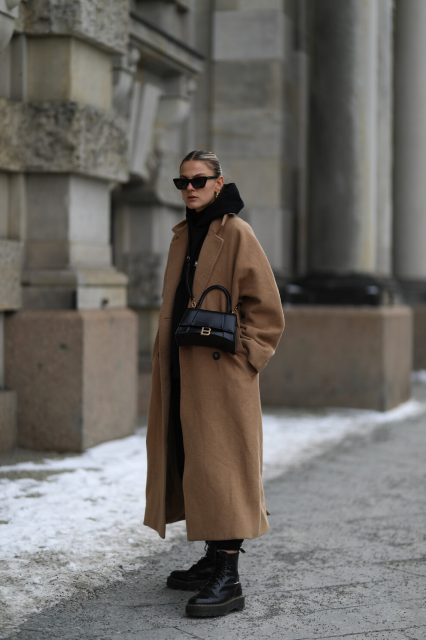 Неделя моды в Париже, октябрь 2020 годаНеделя моды в Стокгольме, февраль 2021 годаС армейскими ботинкамиВысокие ботинки в армейском стиле никогда не покидали модные радары, но в этом году вернулись в тренды с новой силой. Они и станут лучшей обувной партией для классического бежевого пальто длины миди или макси. Такое комбо как нельзя лучше передаст тонкую игру на контрастах - стильная смесь гранжа и элегантности.