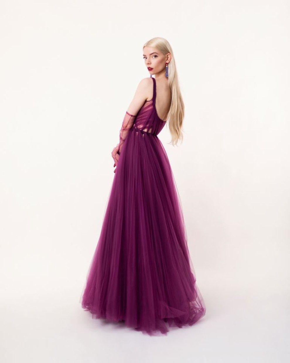 Стилист актрисы Лоу Роуч сделал ставку на сдержанную элегантность – слои мягкого пурпурного тюля в этом образе соединяются с элементами макраме, благодаря чему Аня Тейлор-Джой напоминает сказочную фею. На создание наряда у двух мастеров из ателье Dior ушло 200-часов ручной работы, а финальным аккордом образа стали украшения BVLGARI. Часть поклонников сравнили звезду "Гамбита" с Рапунцель, а часть решили, что она больше похожа на звезд золотой эпохи Голливуда.