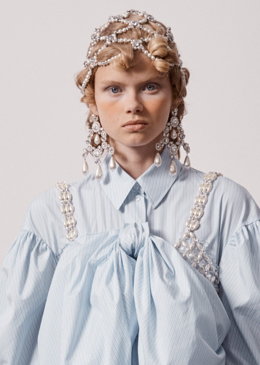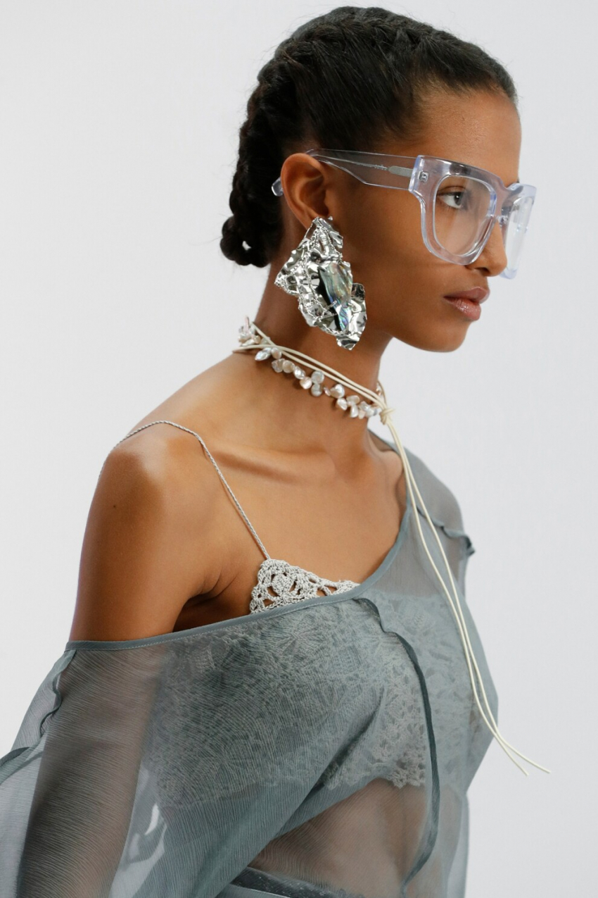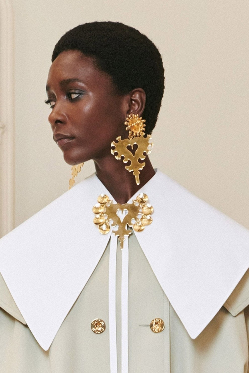Simone RochaВ этом сезоне максимализм является одним из главных трендов. Так, Acne Studios показали массивные серьги абстрактной и слегка текстурированной формы, которые напоминали жатую фольгу, Vivienne Hu продемонстрировали серьги-кольца неправильной формы, Patou предложили украшения преувеличенных размеров в барочном стиле, а у Schiaparelli появились большие позолоченные серьги-пластины, напоминающие медали в ушах.