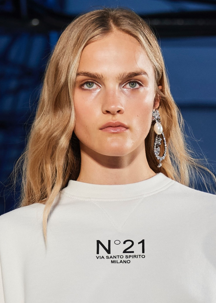 No.21Этой весной модно украшать не только мочки, но и всю поверхность уха. Исходя из этой тенденции бренды показали эффектные каффы, напоминающие доспехи, а также разбросали мини-версии украшений вдоль ушной поверхности. Stella McCartney представили золотой кафф с жемчужинами, повторяющий изгиб уха, Vivetta сделали ставку на романтическое украшение с растительной тематикой, а Alexander McQueen предложили серьги из простых геометрических линий.