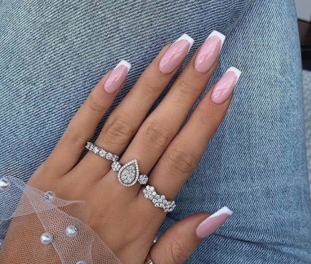 Французский маникюр – это классика для квадратной формы, способная эффектно подчеркнуть женственность рук. Стильный френч будет превосходен в комбинации с блестящими стразами (это может быть узор или отдельно выделенный ноготок). Для ежедневного маникюра можно отдать предпочтение матовому французскому варианту с двойными комбинированными линиями «улыбок». Классический френч можно разнообразить омбре, скотч-лентами или рисунками.