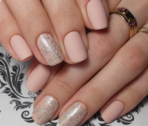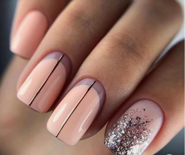 Бежевые ноготки могут быть не только монохромными, но и украшенными золотистой фольгой или глиттером. Также невероятно изысканно смотрятся следующие акценты: