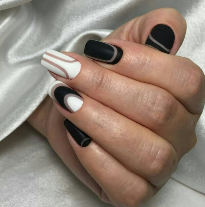 Контрастные горизонтальные полоски смогут с легкостью подчеркнуть ровный изящный срез квадратной ногтевой пластины. Не менее интересно будет смотреться и клетка в нейл-дизайне.