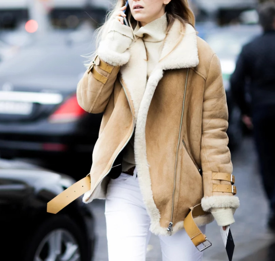 Объемная дубленка лучше всего подойдет для уличного стиля. Она может быть наброшена на плотный свитер крупной вязки. Оверсайз дубленка идеально будет смотреться с вязаным шарфом, шапкой и массивными ботинками.