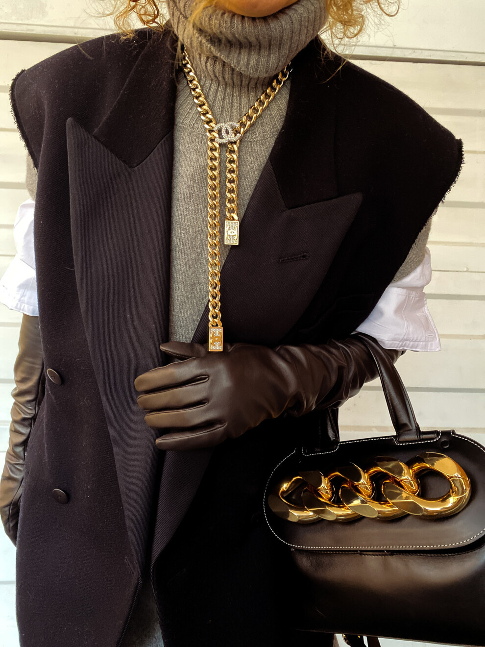 Стритстайл на Неделе моды в КопенгагенеНе теряют своей популярности и цепи, которые триумфально вернулись несколько сезонов назад благодаря Дэниэлу Ли из Bottega Veneta. Самый легкий способ добавить их в образ – аксессуары. Причем датские модницы не ограничиваются лишь одним акцентом, а смело сочетают несколько разнокалиберных цепочек вместе.
