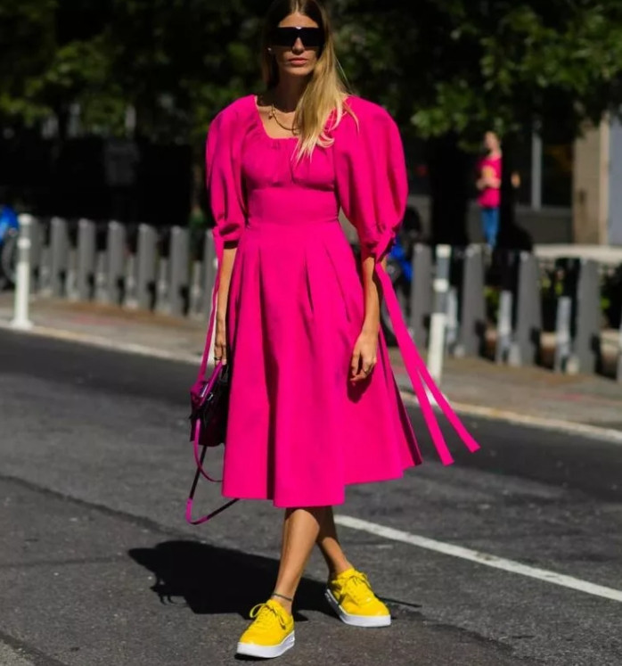 Офисное платье, украшенное объемными рукавами, непременно станет фаворитом рабочего гардероба в сезоне 2021-2022. Подобная модель может иметь приталенный крой и расклешенный низ, наилучшим образом ложась по фигуре.