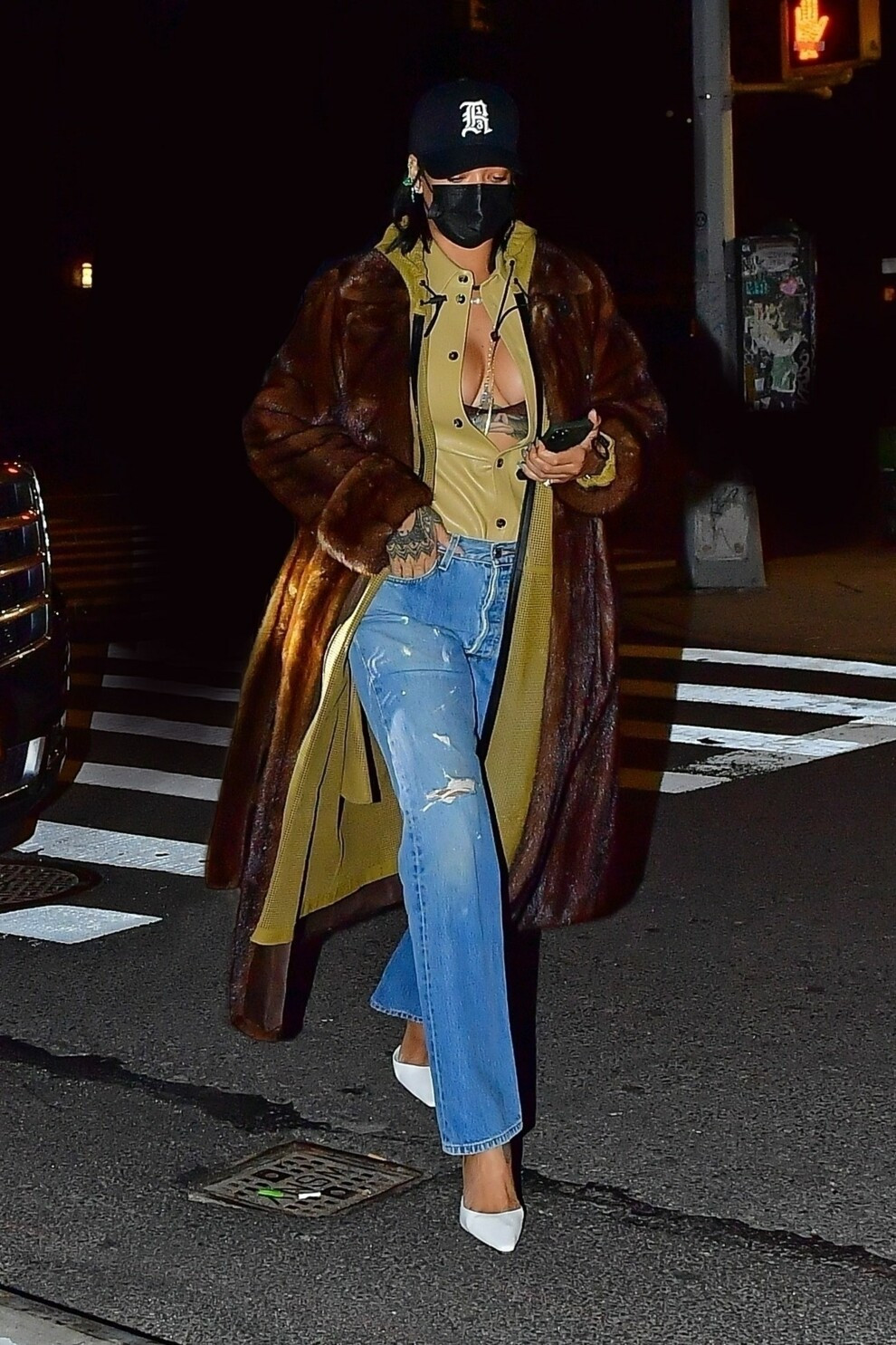 Даже после известия о том, что Рианна и A$AP Rocky провели вместе рождественские праздники на родине певицы в Барбадосе, пара все равно скрывает свой роман. Так, на днях Рири и Раким встретились за ужином в итальянском ресторане Emilio’s Ballato в Нью-Йорке, где шеф-поваром является парень Кэти Холмс, Эмилио Витоло-младший. Папарацци не удалось заснять пару вместе, однако в кадр попал новый образ Рианны. Певица надела синие потертые джинсы, белые туфли-слингбэки Attico, бейсболку R13, кожаную рубашку цвета хаки и соответствующую удлиненную модель с перфорацией из коллекции Bottega Veneta Resort 2021.