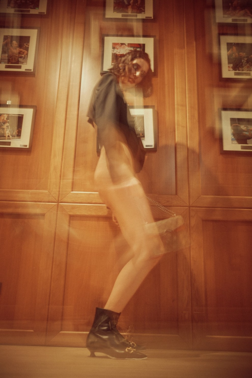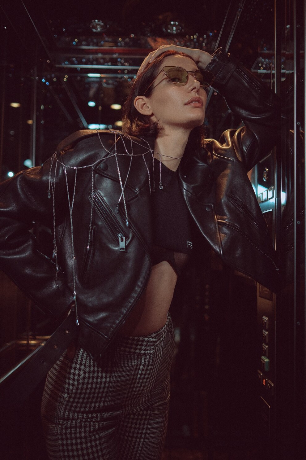Жакет Jacob Lee, бра и лосины GucciВ этой съемке ставка сделана на одновременно практичные и эффектные вещи, которые с одной стороны абсолютно самодостаточны, а с другой, легко сочетаются друг с другом. Так, в этом году нам не обойтись без белоснежной двойки, под которой всегда можно спрятать блестящий топ, платья в бельевом стиле в карамельном оттенке, костюма из эко-кожи на каждый день, пальто в клетку и, естественно, косухи. Правда, стилист проекта выбирает ее укороченную версию, а вот сочетать предлагает ее с обтягивающими топами и нижним бельем.