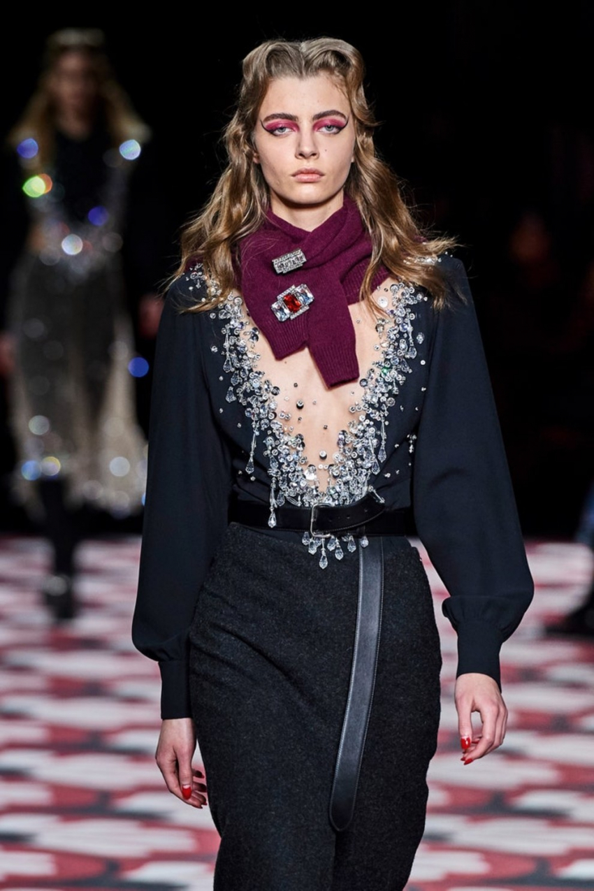 Givenchy осень-зима 2020/2021Обновите свой кардиганКардиган давно не относится к предмету "бабушкиного" гардероба. Сейчас это модная вещь, которую обожают главные streetstyle-звезды и знаменитости. В этом сезоне предлагаем поиграть с его применением и сделать из него шикарный аксессуар. Например, завяжите кардиган вокруг шеи и декольте, и закрепите блестящей брошью, как это сделала Миучча Прада в коллекции Miu Miu осень-зима 2020/2021.