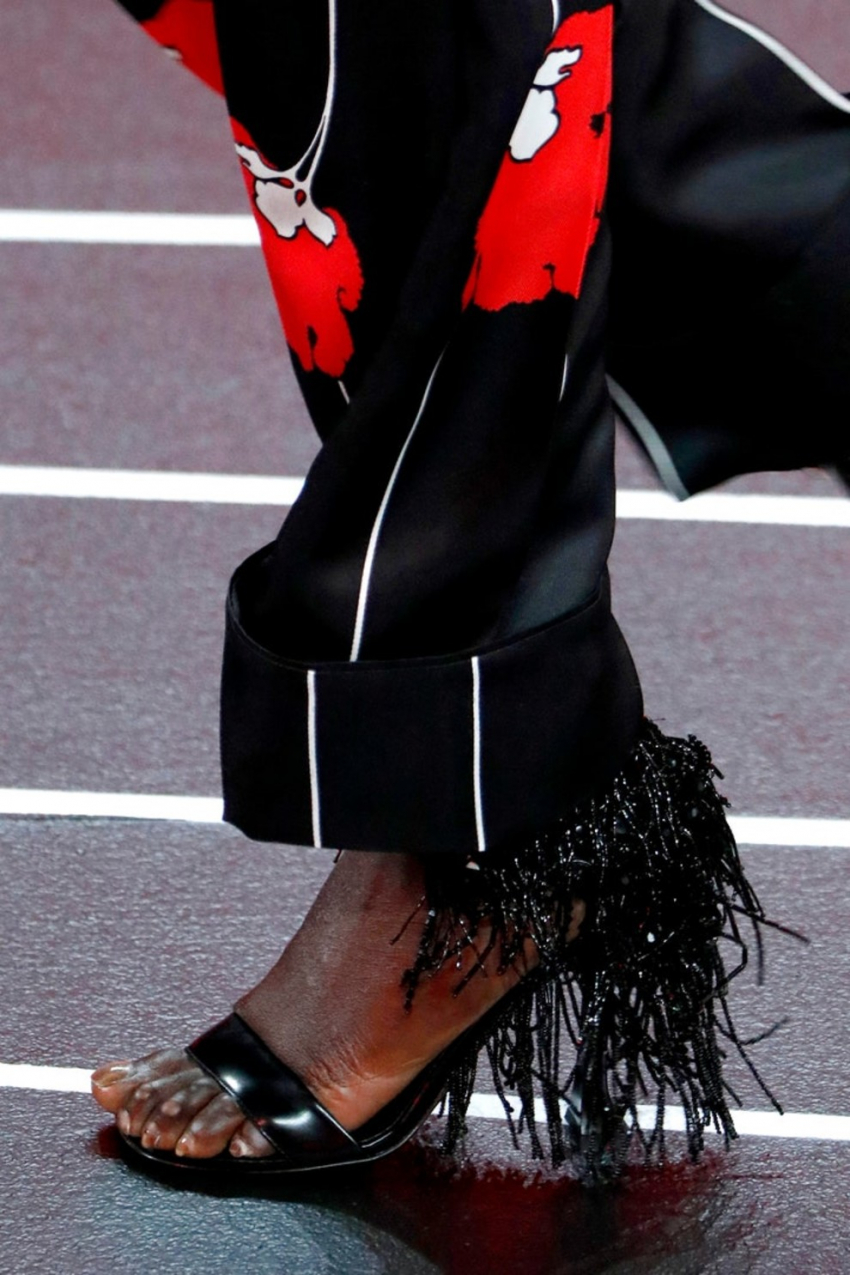 Bottega Veneta осень-зима 2020/2021Добавьте бахромуПревратить утилитарный образ из денима в вечернюю одежду можно с помощь лишь одной детали - босоножек с бахромой. Этот стилистический прием мгновенно добавит гламурные нотки образу.