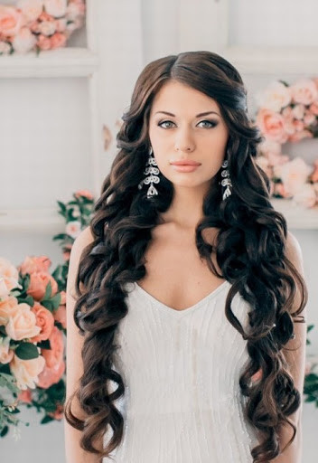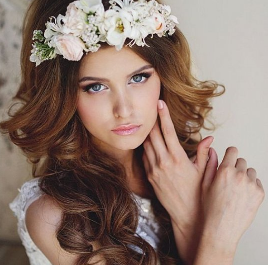 Варианты с завитыми локонами всегда выглядят очень нежно и романтично, они выгодно подчеркнут природную красоту длинных прядей. Можно слегка завить локоны и свободно распустить их по плечам, украсив оригинальным ободком, заколками со стразами или живыми цветами, которые по тону подходят под платье невесты.