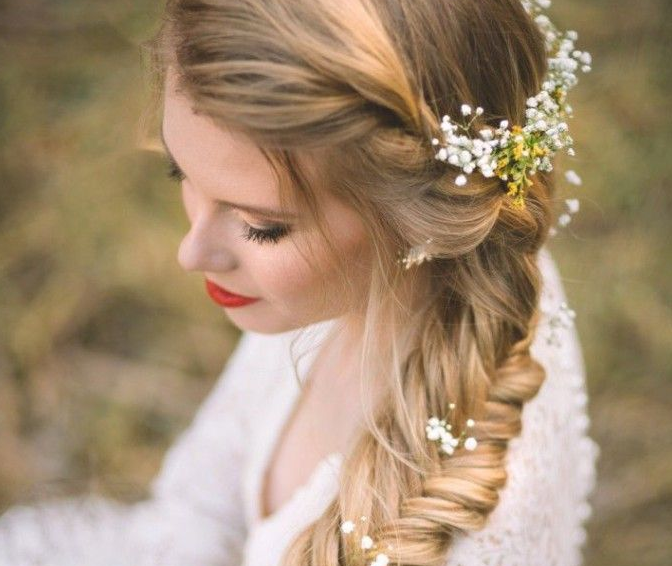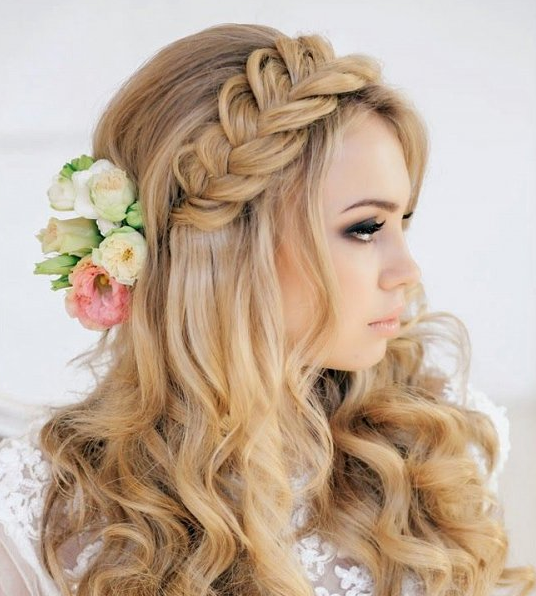 Волосы, заплетенные в тугие косички, можно укладывать в виде венка или красивой короны. Рыхлое плетение отлично сочетается с кудряшками. Из длинных и волнистых волос можно сделать косу-водопад с прядями, небрежно выпущенными по длине.