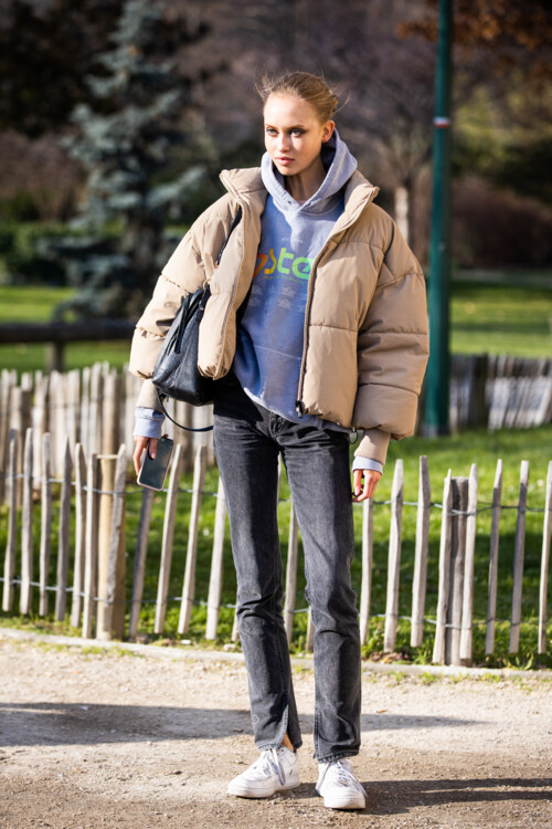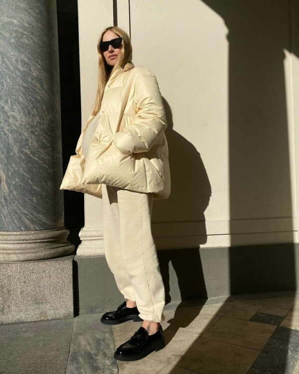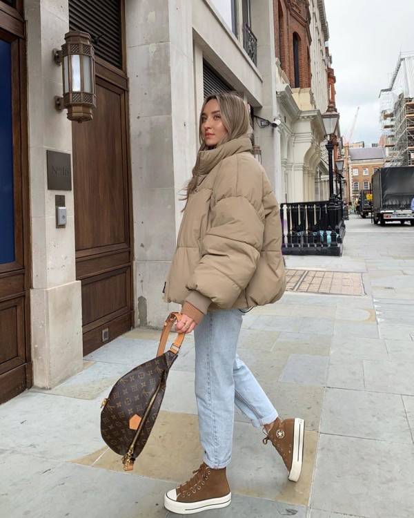 Total lookСамым беспроигрышным вариантом станет лаконичный total look. Играя с оттенками и фактурами, можно легко создать стильный образ, отдав бежевому пуховику главную роль или сделав его правильным дополнением. Советуем сочетать объемный укороченный пуховик с брюками-карго, джинсами или джоггерами молочного цвета.